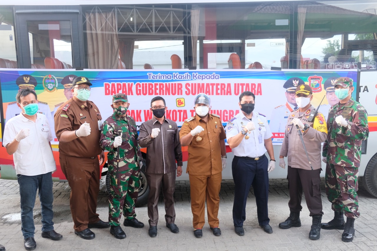 TANJUNGBALAI, DELIK.ID — Wali Kota Tanjungbalai, H.M Syahrial SH,MH bersama Forum Komunikasi Pimpinan Daerah (Forkopimda) Tanjungbalai, Ketua DPRD Tengku Eswin ST, Kapolres TanjungBalai AKBP Putu Yudha Prawira., S.I.K. M.H, Dan Lanal TBA Let Kol Laut (P) Dafris, Dan Dim 0208 Asahan Letkol Sri Marantika., S.Sos, Kepala Kejaksaan Negri Kota TanjungBalai A.A.G Satya Markandea., S.H, General Manager Pelindo I Cab Tanjungbalai Aulia Rahman Hasibuan dan Kepala KSOP Tanjungbalai Afrizal Tanjung menerima kepulangan 146 Tenaga Kerja Indonesia (TKI) asal Tanjungbalai dari Malaysia saat tiba di Pelabuhan Teluk Nibung, Tanjungbalai, Senin (18/5/2020) sore.