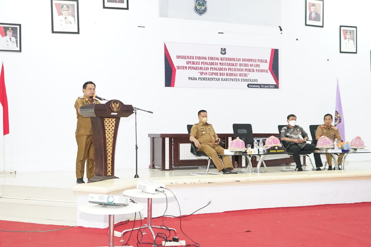 Sosialisasi Undang-undang Keterbukaan Informasi Publik serta Aplikasi Pengaduan Masyarakat Secara On Line Sistem Pengelolaan Pengaduan Pelayanan Publik Nasional SP4N LAPOR dan BARUGA SULSEL. Acara berlangsung di ruang pola Kantor Bupati Enrekang, Selasa (15/6/2021)