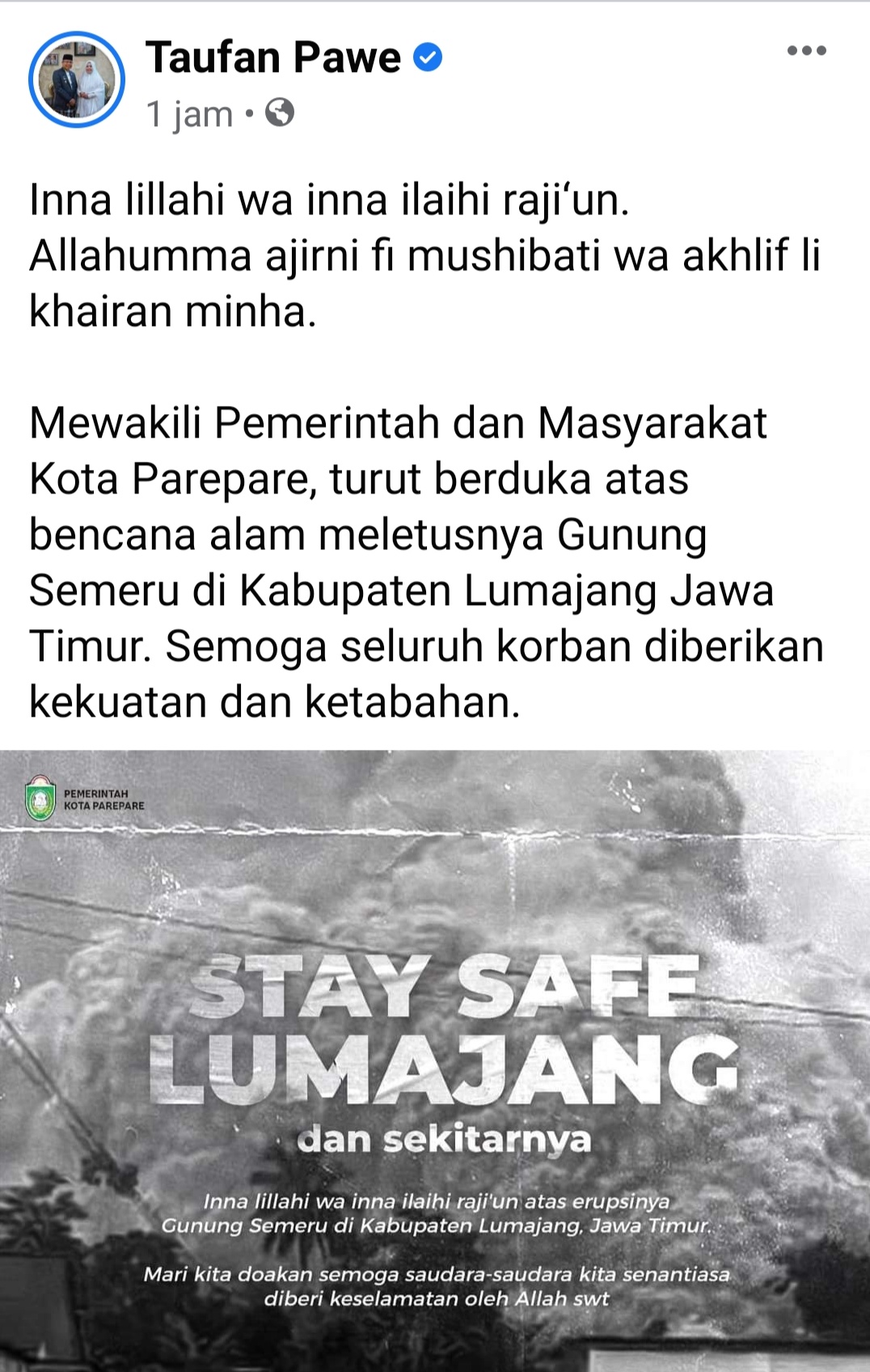Wali Kota Parepare, Taufan Pawe pun menyampaikan duka yang mendalam atas musibah yang menimbah saudara-saudara yang berada di sekitaran Gunung Semeru.