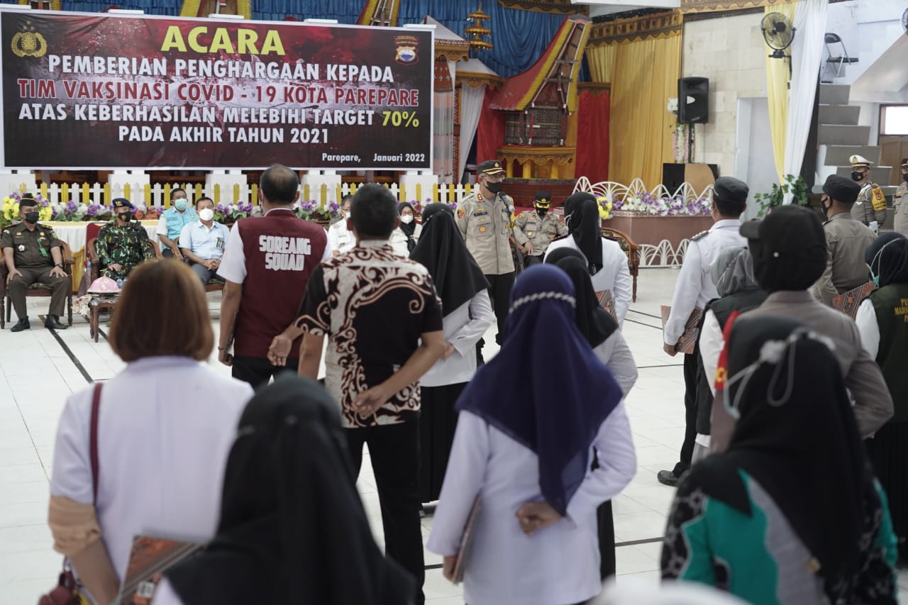 PAREPARE, delik.id — Kepolisian resort polres parepare,sulawesi selatan,memberikan penghargaan kepada ratusan vaksinator di kota parepare,sulawesi selatan,karena telah mencapai terget 70 persen vaksin di tahun 2021,di gedung serbaguna polres parepare,sulawesi selatan,kamis siang.