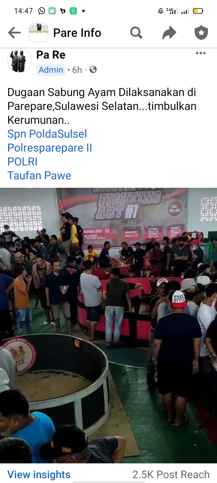 PAREPARE, delik.id — Foto dugaan sabung ayam berkedok Kontes Fighting Art ayam bangkok diduga dilaksanakan di gedung salah satu BUMN Kota Parepare viral di media sosial.