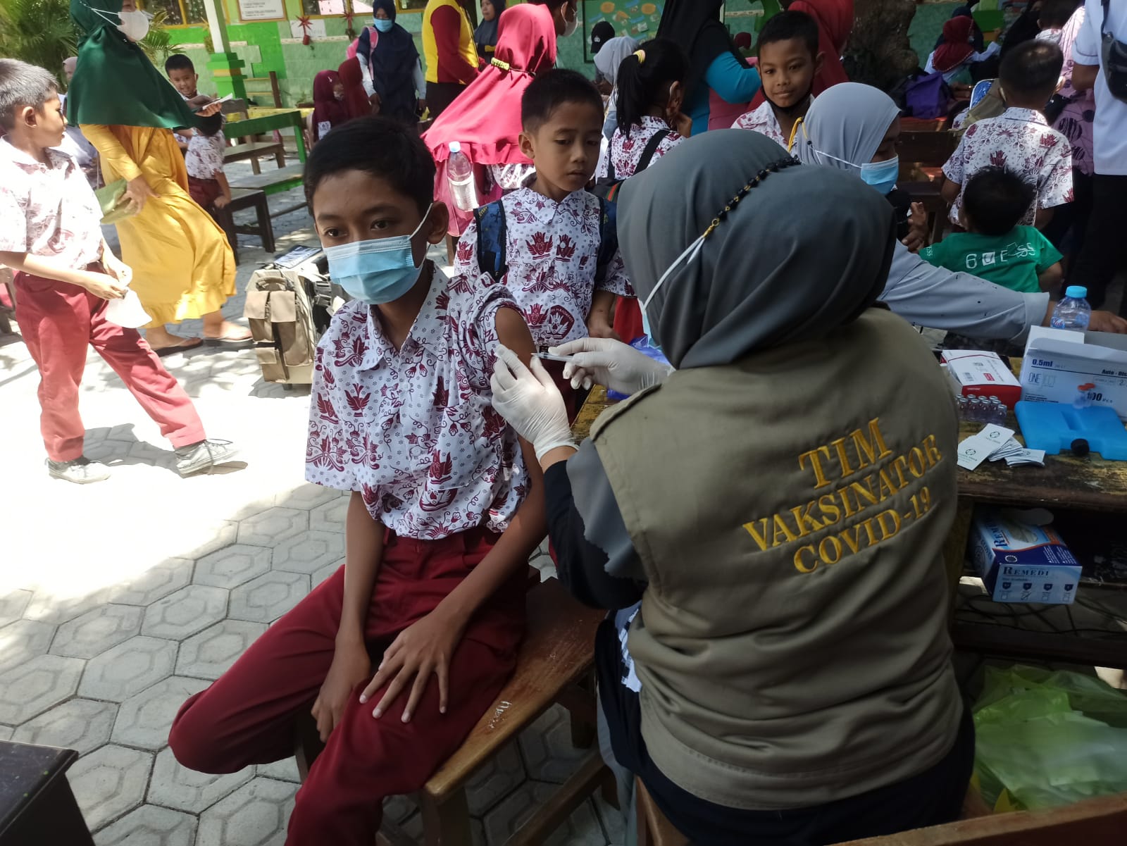 Sekira 220 siswa kelas I-VI mendapatkan vaksinasi dosis pertama, dari Tim Vaksinator PKM Maiwa.