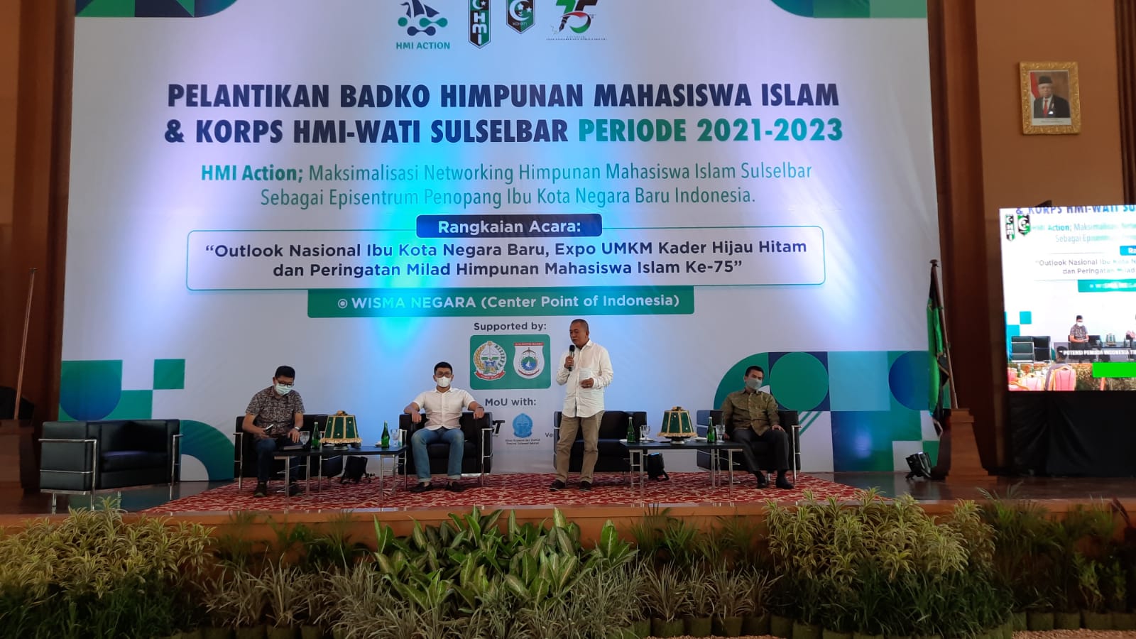 MAKASSAR,DELIK ID — Bupati Kabupaten Polewali Mandar Andi Ibrahim Masdar bawakan materi strategi dan kesiapan Indonesia Timur sebagai penyangga Ibukota Negara saat menjadi narasumber yang dirangkai dalam pelantikan Badan Koordinasi HMI Sulawesi Selatan dan Barat.