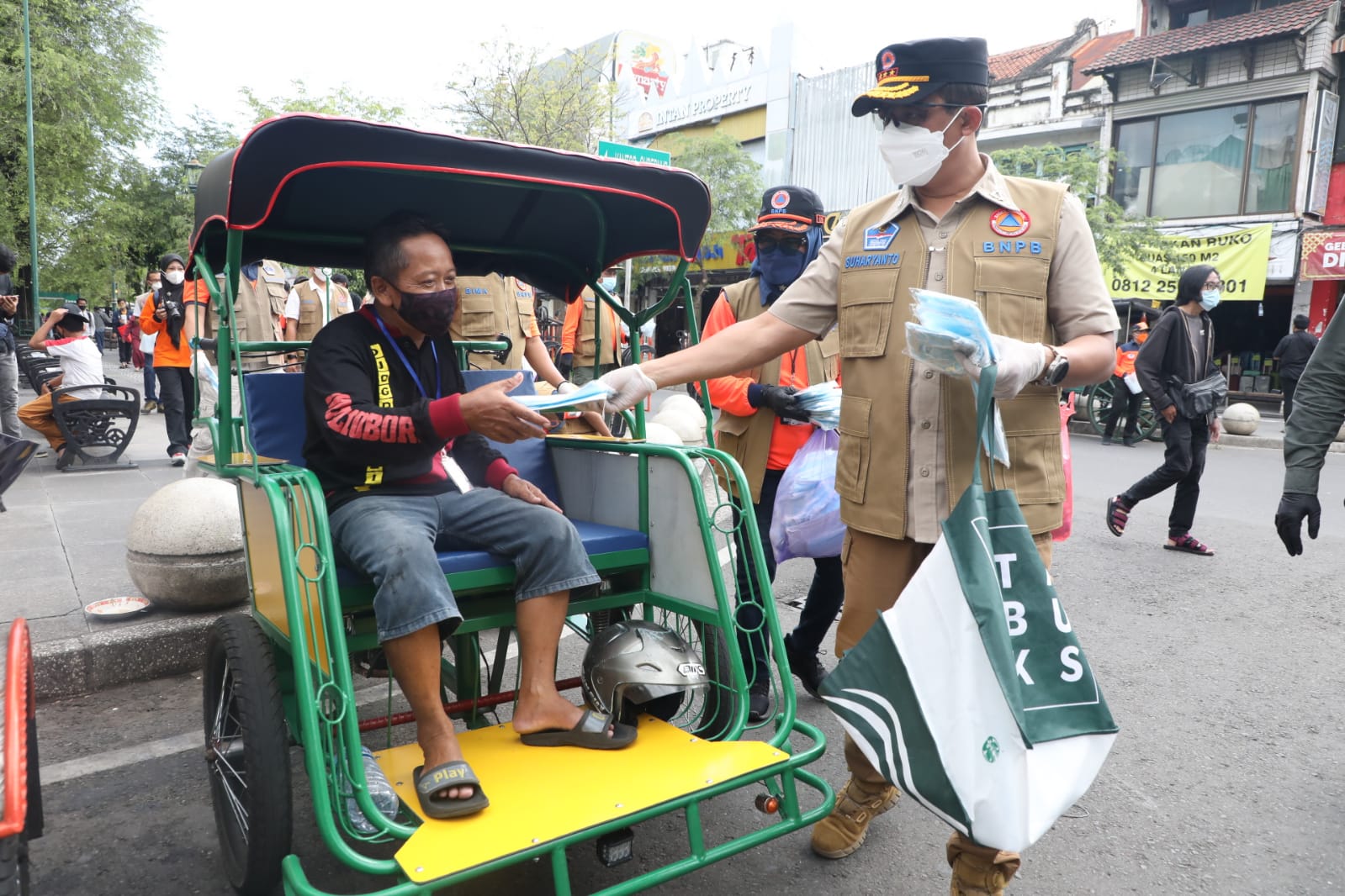 “Melanjutkan kegiatan yang sudah dilakukan minggu-minggu sebelumnya, BNPB membagikan masker di beberapa daerah yang mengalami peningkatan kasus Covid, DKI Jakarta, kemudian Jawa Barat dan kemarin di Jawa Tengah, sekarang beralih ke Yogyakarta,” ucap Suharyanto saat membagikan masker di kawasan Malioboro, Kota Yogyakarta, Provinsi Yogyakarta.