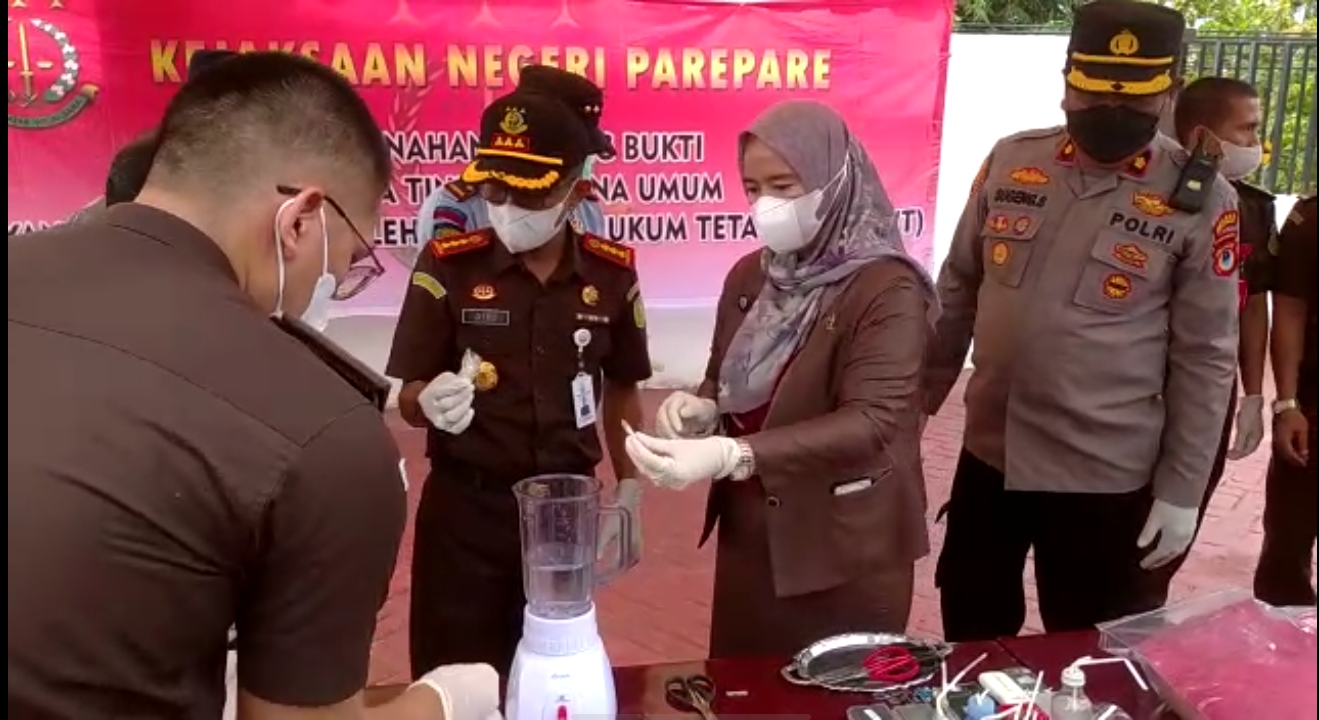 PAREPARE, delik.id — Kejaksaaan negeri Kota Parepare, Sulawesi Selatan memusnahkan sekira 55,64 gram sabu-sabu dengan 56 terdakwa. Bungkusan 55,64 gram sabu-sabu itu dimusnahkan dengan cara diblender di halaman Kantor Kejari Parepare, Sulawesi Selatan.