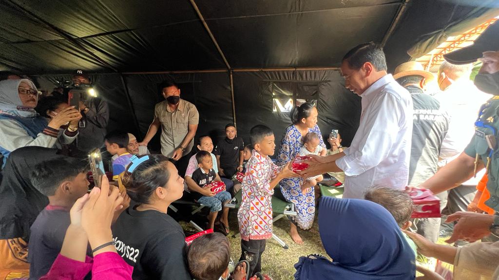 CIANJUR, delik.id— Presiden Joko Widodo meninjau langsung lokasi terdampak gempa bumi, di Kabupaten Cianjur, Provinsi Jawa Barat, pada Selasa, 22 November 2022. Dalam kesempatan tersebut, Presiden mengunjungi tenda pengungsian di Taman Prawatasari yang menjadi tempat tinggal sementara para warga yang terdampak gempa bumi.