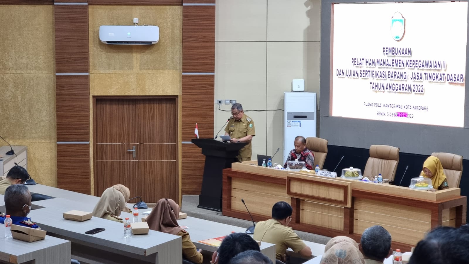 PAREPARE, DELIK.ID – Wali Kota Parepare Taufan Pawe yang diwakili oleh Wakil Wali Kota Parepare Pangerang Rahim membuka secara resmi Pelatihan Manajemen Kepegawaian II dan Ujian Sertifikasi Barang/Jasa Tingkat Dasar Tahun Anggaran 2022 di Ruang Pola Kantor Wali Kota Parepare. Senin, 5/12/2022.