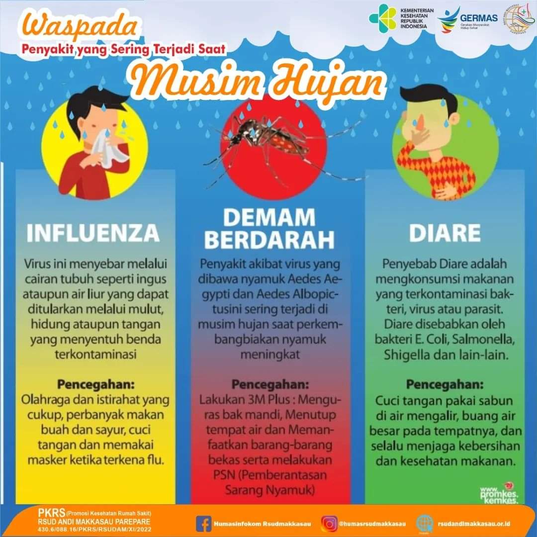 Di antaranya influenza, demam berdarah Dengue(DBD), dan diare. Melalui akun media sosial resminya, RSUD Andi Makkasau memberi kiat untuk mencegah ketiga penyakit itu.
