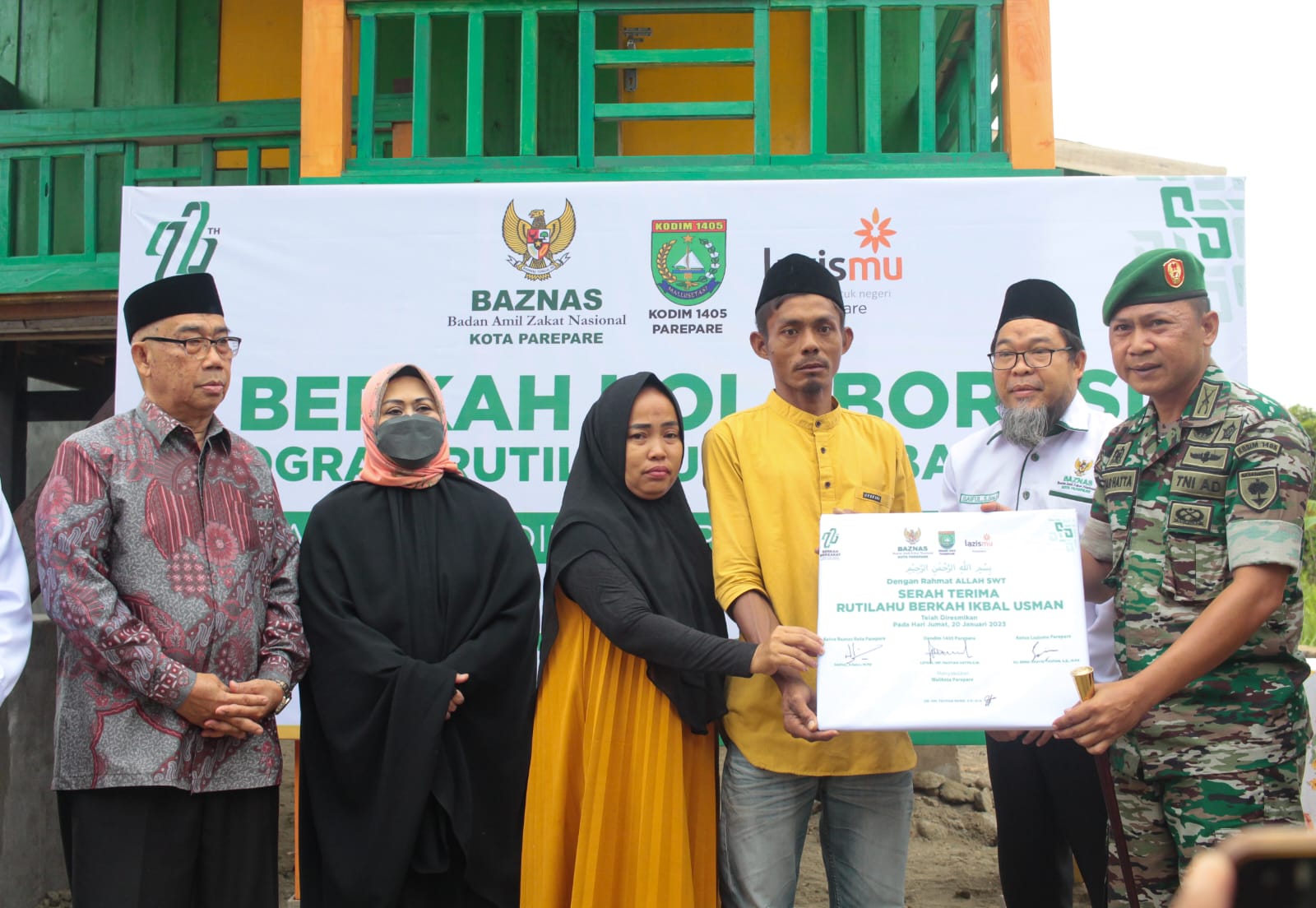 Peremian dan serah terima Rumah Tinggal Layak Huni (RUTILAHU) ini program Kolaborasi Badan Amil Zakat Nasional (Baznas) Kota Parepare, Kodim 1405 Parepare dan Lazismu Kota Parepare dilaksanakan 20 Januari 2023 di Tegal dua Jalan Bukit Madani Kelurahan Lapadde kota Parepare.