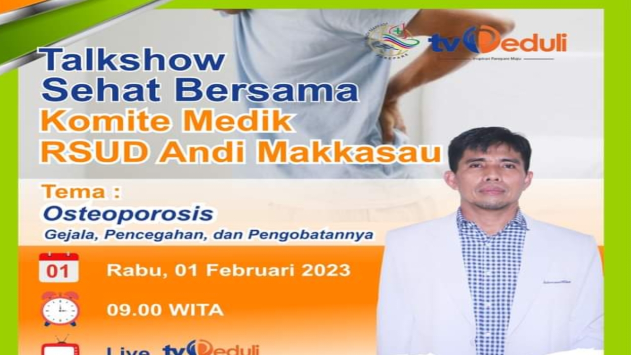 Kali ini Talkshow Sehat Bersama Komite Medik RSUD Andi Makkasau Kota Parepare, menghadirkan ulasan dengan tema “Osteoporosis”, bagaimana gejala dan cara pencegahannya.