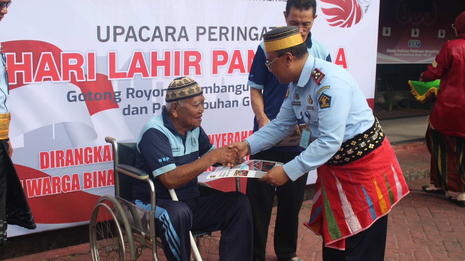 Adapun, tema Hari Lahir Pancasila tahun ini yaitu “Gotong Royong membangun Peradaban dan Pertumbuhan Global”. Para peserta upacara mengenakan pakaian adat nasional.