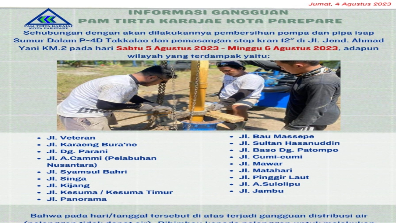 Dalam pengumuman itu, PAM Tirta Karajae mengatakan gangguan tersebut disebabkan adanya pembersihan pompa dan pipa isap sumur dalam P-4D Takkalao.