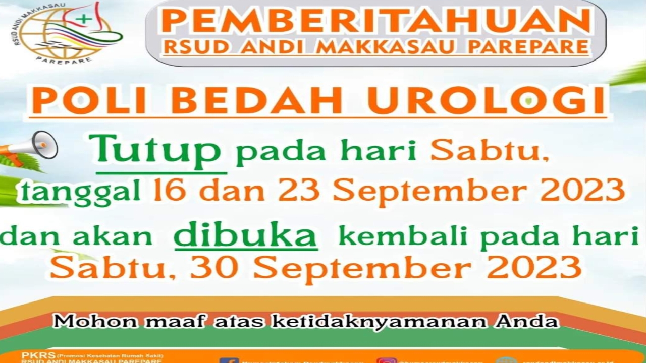 PAREPARE, DELIK.ID – Rumah Sakit Umum Daerah (RSUD) Andi Makkasau Parepare mengeluarkan informasi bahwa Poli Bedah Urologi akan tutup pada hari Sabtu tanggal 16 dan 23 September 2023.
