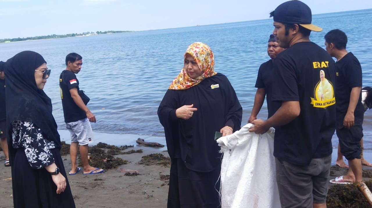 Menariknya, Bakal Calon (Bacalon) Wali Kota Parepare Erna Rasyid Taufan (ERAT) berbaur dengan anggota Komunitas Pacekke menelusuri pasir pantai melakukan aksi bersih ini.