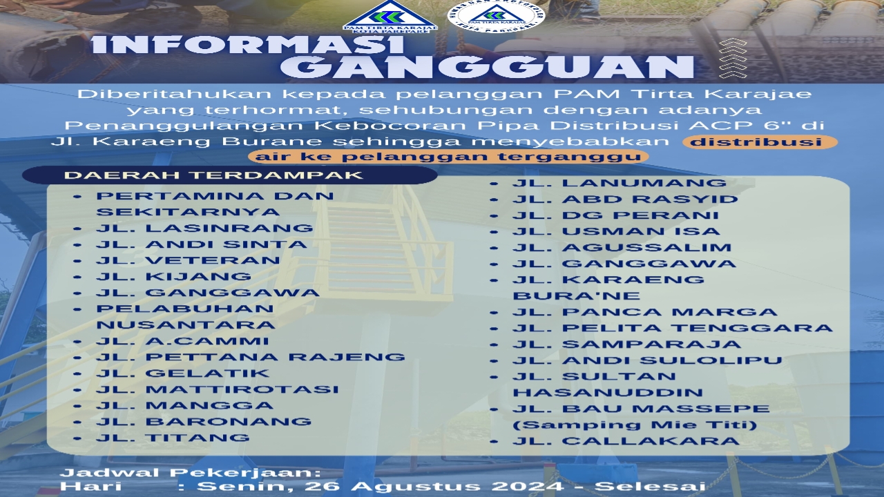 Gangguan ini disebabkan oleh penanggulangan kebocoran pipa distribusi ACP 6″ di Jl. Karaeng Burane.