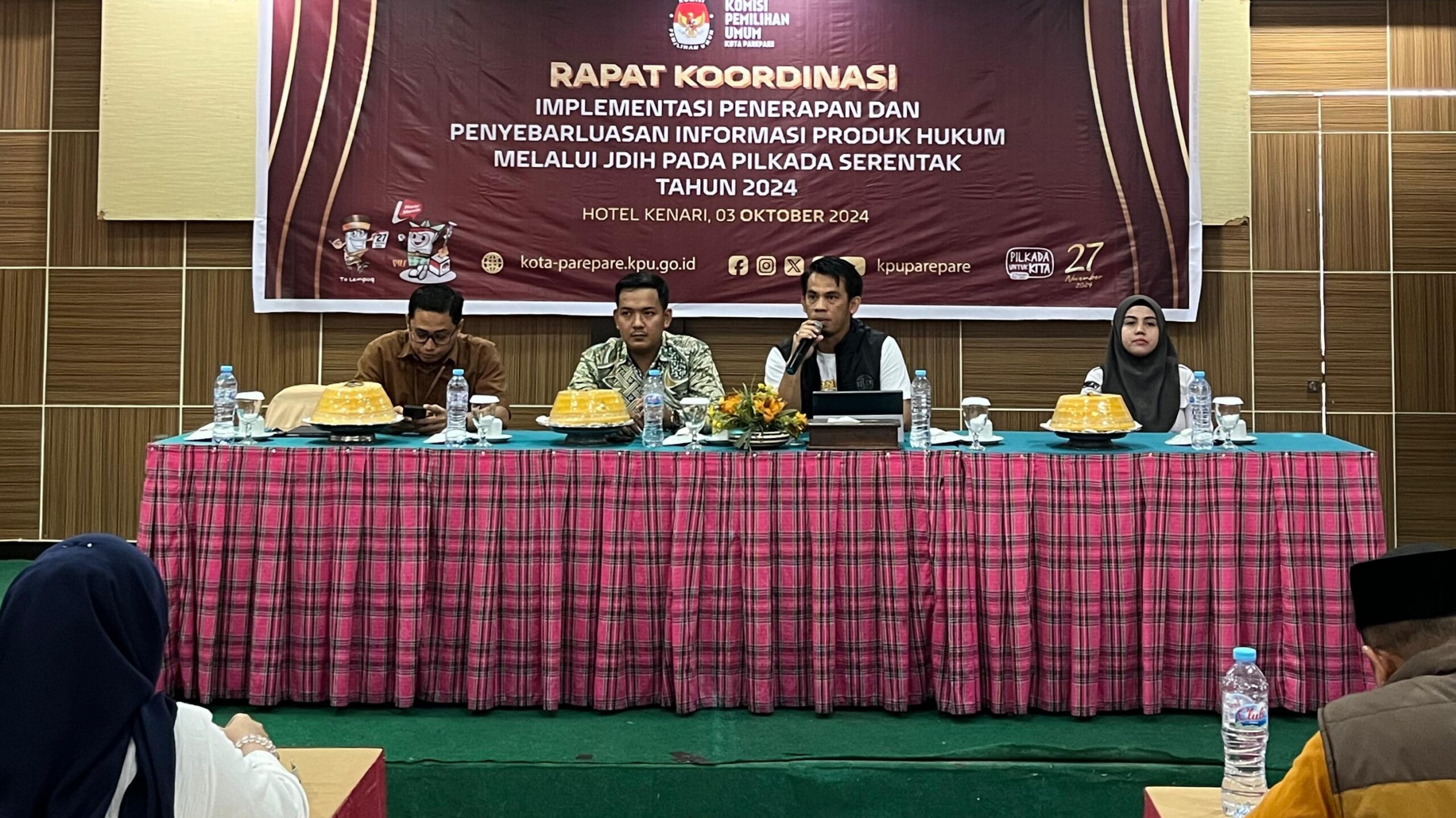 PAREPARE, DELIK.ID-Dalam menyebar luaskan informasi pada pilkada serentak 2024, khusunya bidang hukum, KPU kota Parepare, menggelar Rakor Implementasi Penerapan dan Penyebarluasan Informasi Produk Hukum Melalui JDIH Pada Pilkada Serentak Tahun 2024.