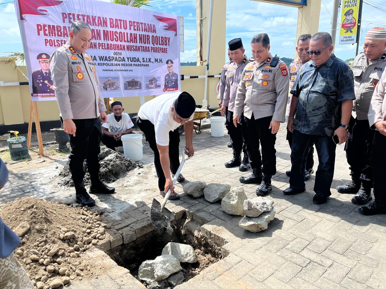 PAREPARE, DELIK.ID — Kapolres Parepare AKBP Indra Waspada Yuda, S.I.K., M.H memimpin langsung kegiatan peletakan batu pertama pembangunan Mushollah Nur Qolbby di halaman Mapolsek Kawasan Pelabuhan Nusantara (KPN), Jalan Pinggir Laut, Kelurahan Mallusetasi, Kecamatan Ujung, Kota Parepare, Jumat (7/11/2025) sekitar pukul 13.45 Wita.