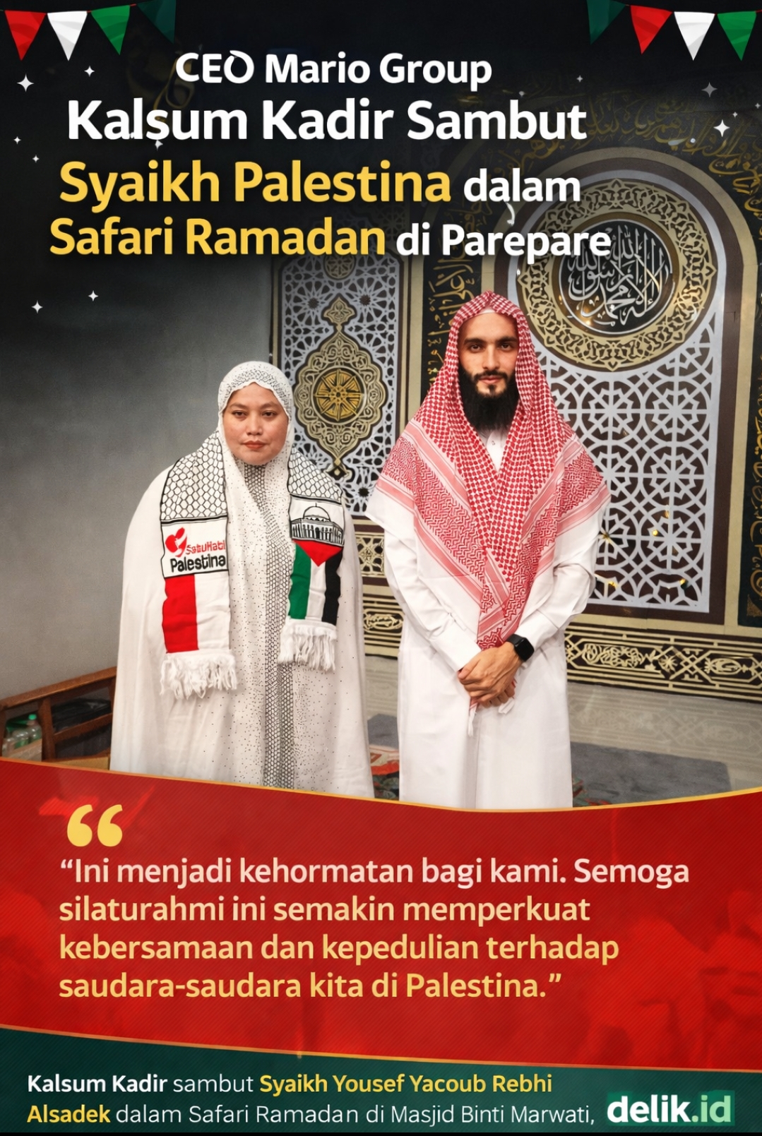 PAREPARE, DELIK.ID – CEO Mario Group, Kalsum Kadir, menyambut kedatangan ulama asal Palestina, Syaikh Yousef Yacoub Rebhi Alsadek, dalam rangkaian Safari Ramadan di Masjid Binti Marwati, Kompleks Perumahan Mario City, Kelurahan Galung Maloang, Kecamatan Bacukiki, Kota Parepare, Jumat (27/2/2026).